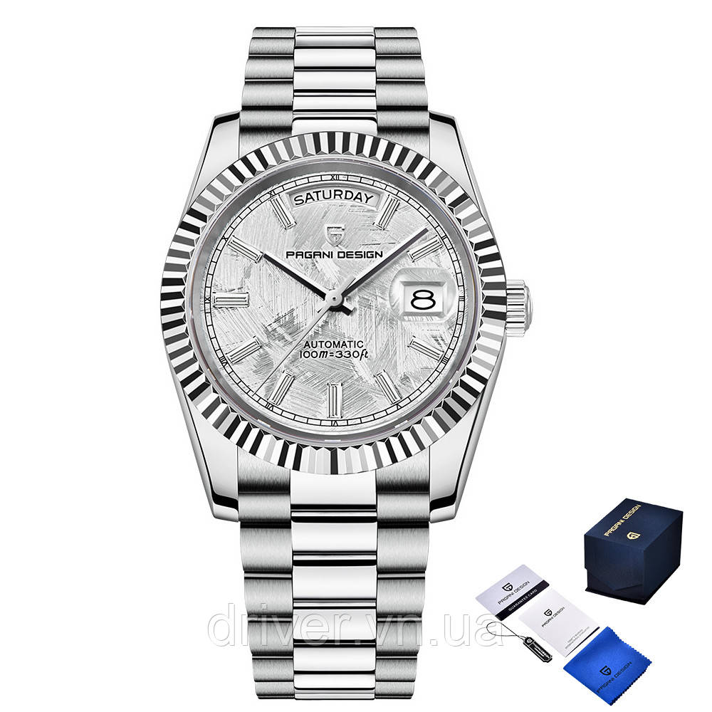Годинник Pagani Design PD-1783 Silver-White – це стильний механічний годинник з автопідзаводом, який поєднує в собі елегантний дизайн та функціональність. Він має круглу форму корпусу з нержавіючої сталі та сріблястий колір, що надає йому сучасного вигляду. Цей чоловічий годинник оснащений сапфіровим склом і водонепроникний на глибину до 100 метрів, що робить його ідеальним для активного способу життя. Циферблат з індикацією годин, хвилин, секунд та календарем вражає чіткістю, а також містить арабські цифри та крапки для зручності читання часу. Годинник комплектується браслетом з нержавіючої сталі з довжиною 20 см і має загальну вагу 149 г. Виробляється в Китаї і забезпечується гарантією на 12 місяців. Його стиль підходить для casual та класичних образів.